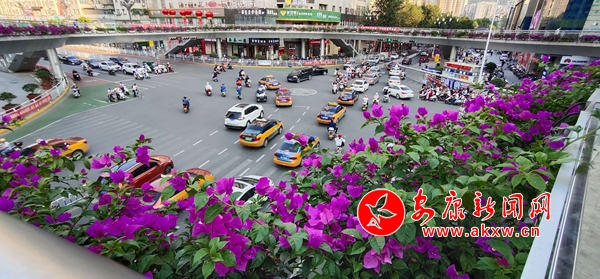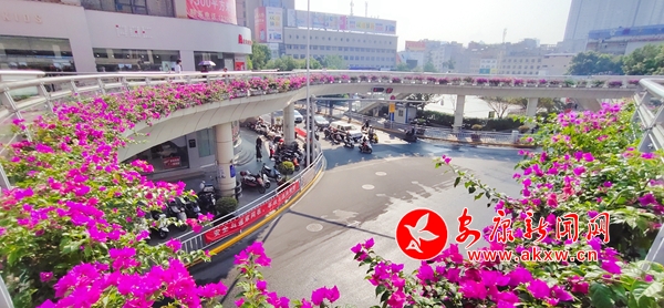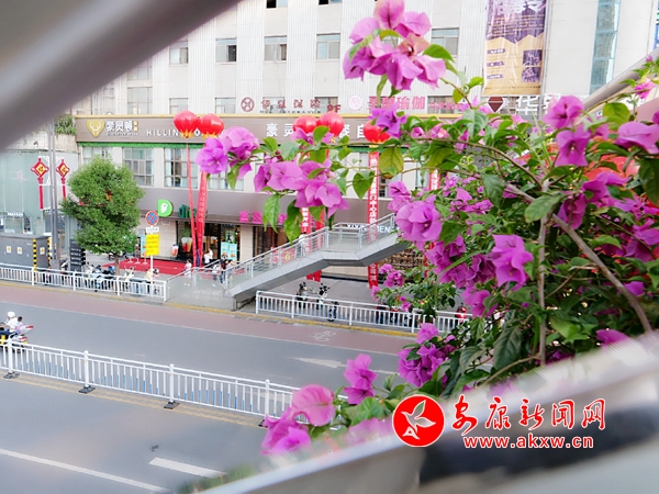 本網(wǎng)訊 (記者 艾蓓)日前,記者途徑安康城區(qū)各大人行天橋時(shí)發(fā)現(xiàn),一抹鮮艷的色彩映入眼簾,遠(yuǎn)遠(yuǎn)地就看到一簇簇三角梅沿著天橋欄桿一字排開,玫紅色的花朵在綠葉的映襯下更顯絢麗。原本“呆板乏味”的人行天橋在鮮花的裝扮下,變得姿態(tài)萬千,生氣十足,人在橋上行走,仿佛在花廊中穿行,讓人心曠神怡。