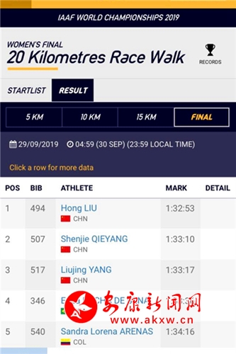 本報訊(記者 魏濤 通訊員 章理)9月30日,在2019年多哈田徑世錦賽女子20公里競走決賽中,中國隊包攬前三名。現(xiàn)世界紀(jì)錄保持者劉虹以1小時32分53秒獲得冠軍;名將切陽什姐獲得亞軍,安康籍運動員楊柳靜以1小時33分17秒獲得季軍,這是中國田徑隊歷史上第一次在世錦賽單項目上包攬前三。