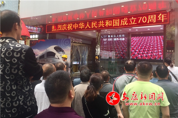 市民們觀看慶祝中華人民共和國70周年大會實(shí)況轉(zhuǎn)播。(攝影 張喬)