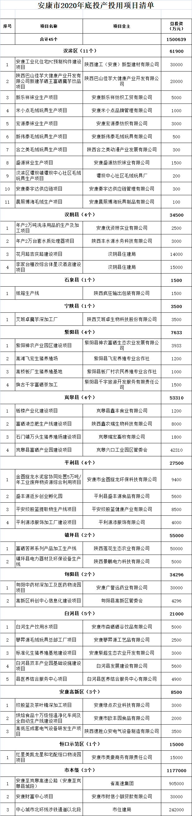 安康市2020年底集中投產投用重點項目清單