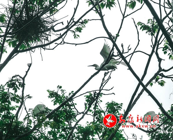 本網(wǎng)訊(記者 潘潤(rùn)生 實(shí)習(xí)記者 安。┰诮ㄔO(shè)中的高新區(qū)新時(shí)代大道施工現(xiàn)場(chǎng),遠(yuǎn)遠(yuǎn)望去,有一片“突兀”的小樹林,林中有30多個(gè)鳥窩,大量白鷺在樹叢中引吭、飛舞。4月23日,大雨滂沱,記者在接到線索趕到這里時(shí),就立刻被這雨中雪白的精靈震撼、吸引。