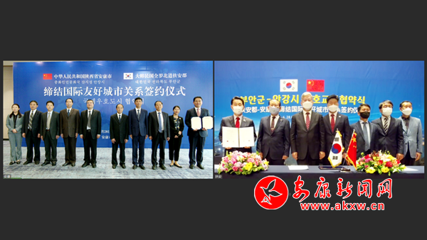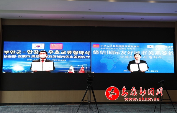 本網(wǎng)訊(記者 艾蓓 通訊員 梁石)4月28日,“中華人民共和國陜西省安康市和大韓民國全羅北道扶安郡締結(jié)國際友好城市關(guān)系簽約儀式”通過互聯(lián)網(wǎng)線上舉行,兩地正式簽署建立國際友好城市關(guān)系協(xié)議書。市長趙俊民、市人大常委會副主任周永鑫、市政府秘書長陳伍文,扶安郡郡守權(quán)翼鉉、扶安郡議會議長文燦奇等嘉賓分別在兩地出席簽約儀式,中國駐韓國光州總領(lǐng)事張承剛應邀參加活動。