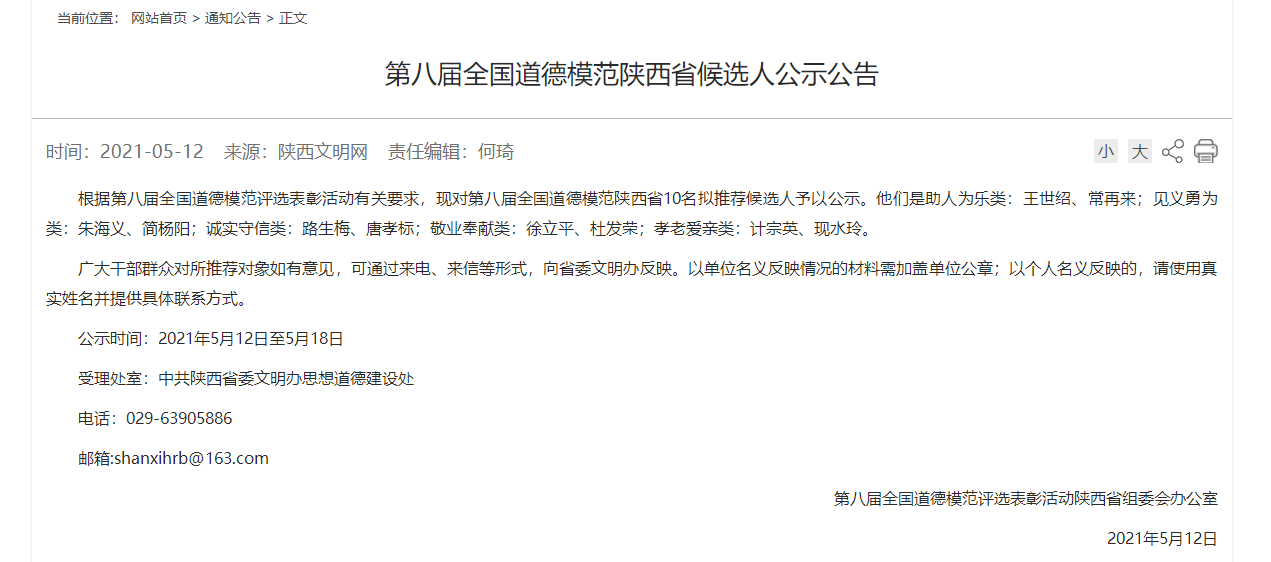5月12日,陜西文明網(wǎng)發(fā)布第八屆全國(guó)道德模范陜西省候選人公示公告,對(duì)第八屆全國(guó)道德模范陜西省10名擬推薦候選人予以公示,我市旬陽(yáng)縣居民朱海義入選見(jiàn)義勇為候選人名單。