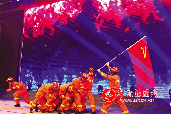 (6月26日,“永遠(yuǎn)跟黨走·逐夢火焰藍(lán)”安康市消防救援支隊(duì)?wèi)c祝建黨100周年文藝匯演在石泉大劇院精彩上演,參加演出的消防員用嘹亮的歌聲、熱情的舞蹈真摯的表達(dá)感謝黨、感恩黨、祝福黨。劉紀(jì)麟 攝)