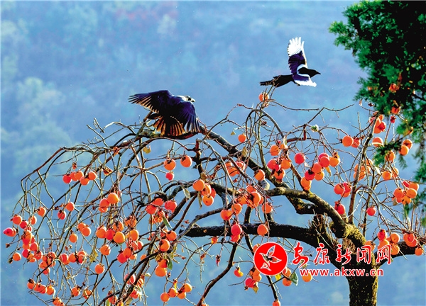 一次在漢濱區(qū)茨溝鎮(zhèn)西溝村拍鳥,當時正值秋收時節(jié),柿子樹上掛滿了熟透的柿子。張東風看到兩位農民在摘柿子,但是他們并沒有把樹上的柿子全部摘完,而是留了一些紅彤彤的柿子掛在樹上。