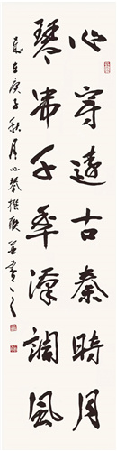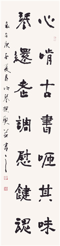 其中以書法進益尤快, 在趙心琴看來,畫家必須勤習書法,她認為好的書法必須出于情理之中、法度之外,性情中人的她書法也是性情之作,常常隨著性情表達自己的心境。她可以從行書中求變化,楷書中找活潑,在隸書中也不墨守成規(guī),重視臨摹但不拘泥于過去的范本,每一幅書法作品都是自己針對不同的主體作出的創(chuàng)作,每幅作品都求新求變。同時她認為稱心的國畫作品必須把好題款這道關,如此方才相映成輝。2012年,省圖書館舉辦陜西作家書畫展,趙心琴應邀出席,觀展時觸景生情,三五天后,一副不忘家鄉(xiāng)養(yǎng)育恩“巴山承心志,漢水潤琴音”的嵌名處女聯(lián)誕生了!此后,興致所致,偶有妙句成聯(lián)。再后來,一發(fā)不可收,僅以她的名字“心琴”二字,前后不重復,內容不重復,陸陸續(xù)續(xù)累計撰寫了三百多副藏名聯(lián)。據(jù)趙心琴講:有時她為一字的斟酌耗費幾天精力,甚至夜不成寐。