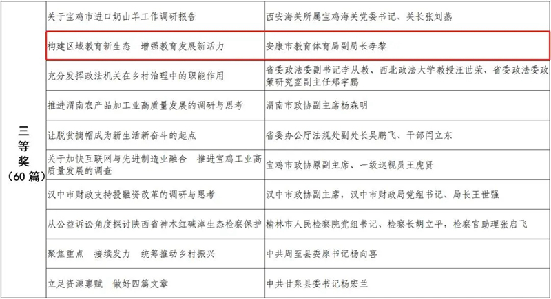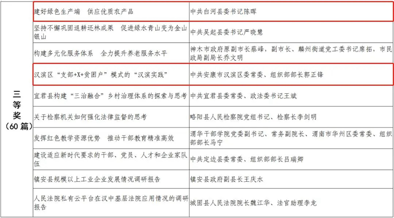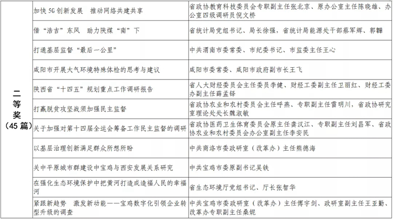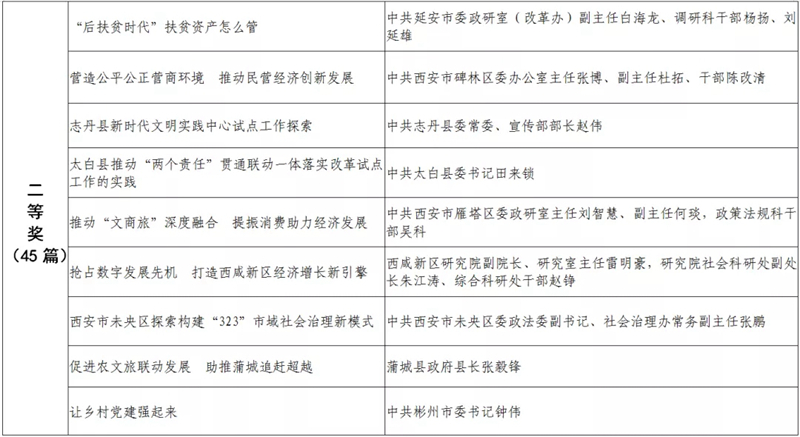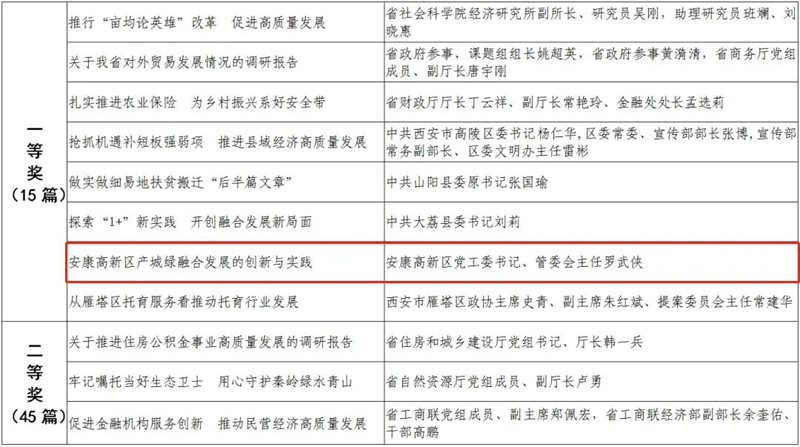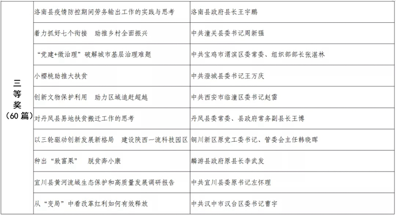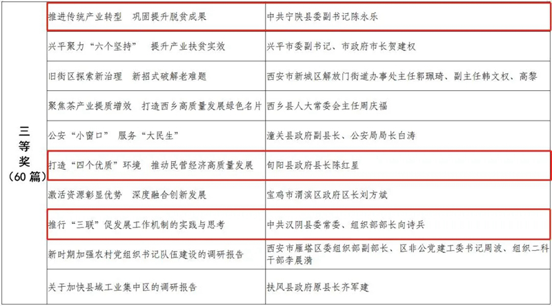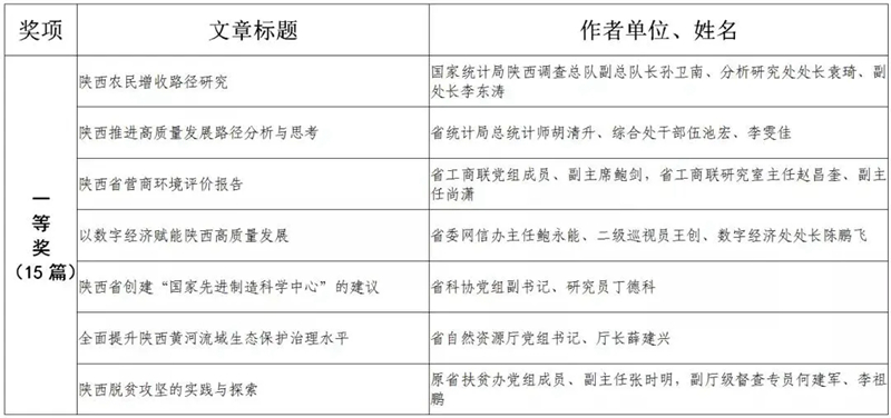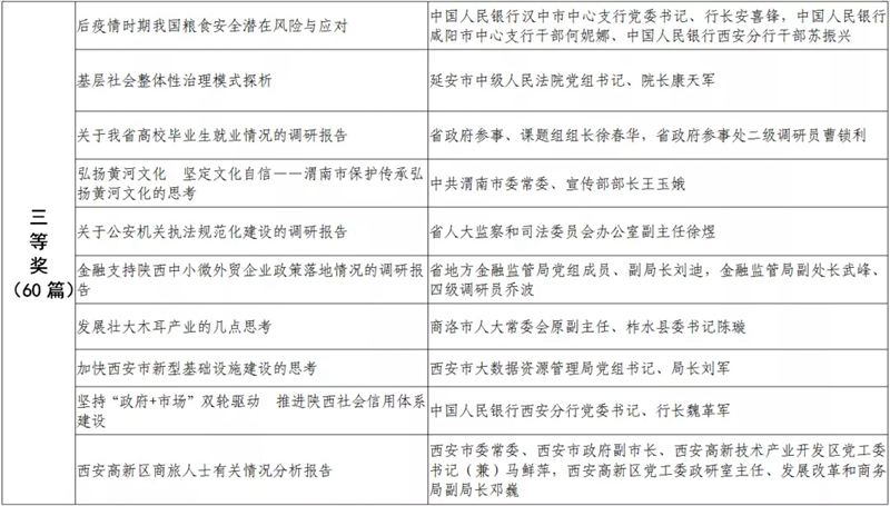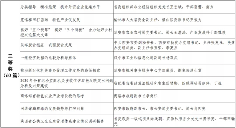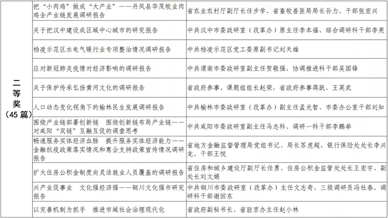 據(jù)悉,全省黨政領導干部優(yōu)秀調(diào)研成果評選工作迄今已開展了18年。本次評選活動從全省市縣兩級和省級各部門上報的487篇縣處級以上黨政領導干部調(diào)研報告中,評出獲獎優(yōu)秀調(diào)研成果120篇。其中,《陜西農(nóng)民增收路徑研究》等15篇獲一等獎,《關于推進住房公積金事業(yè)高質(zhì)量發(fā)展的調(diào)研報告》等45篇獲二等獎,《后疫情時期我國糧食安全潛在風險與應對》等60篇獲三等獎。