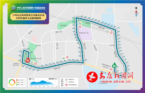 9月8日上午,十四運會和殘?zhí)貖W會圣火將在安康國家高新技術產業(yè)開發(fā)區(qū)進行第12站傳遞,屆時將有63名滿懷激情的火炬手,高舉象征希望的圣火跑完全程。安康火炬?zhèn)鬟f路線全長5.7公里,起跑點為安康高新區(qū)創(chuàng)新創(chuàng)業(yè)中心,途徑花園大道、學府路、秦嶺大道、安康大道,收火點為安康高新區(qū)秦巴生態(tài)文化公園。整個線路散發(fā)著生態(tài)、文明、奮進的氣息,集中展示了十八大以來安康經濟社會高質量發(fā)展成果。