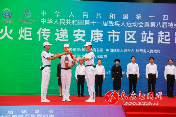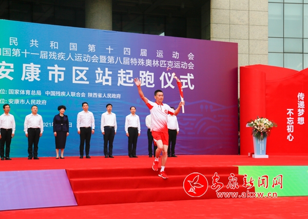 省殘疾人聯(lián)合會(huì)理事長、殘?zhí)貖W會(huì)組委會(huì)執(zhí)行副秘書長相紅霞,市委書記、十四運(yùn)會(huì)和殘?zhí)貖W會(huì)安康市執(zhí)委會(huì)主任趙俊民,市委副書記、市長武文罡,原陜西省南水北調(diào)辦公室主任、十四運(yùn)會(huì)和殘?zhí)貖W會(huì)場館建設(shè)部駐會(huì)副部長朱昱,省生態(tài)環(huán)境廳二級巡視員、十四運(yùn)會(huì)和殘?zhí)貖W會(huì)組委會(huì)環(huán)境治理部駐會(huì)副部長王文,市委常委、宣傳部部長羅雪劍出席火炬?zhèn)鬟f起跑儀式;鹁?zhèn)鬟f起跑儀式由副市長、十四運(yùn)會(huì)和殘?zhí)貖W會(huì)安康市執(zhí)委會(huì)副主任楊淼主持。