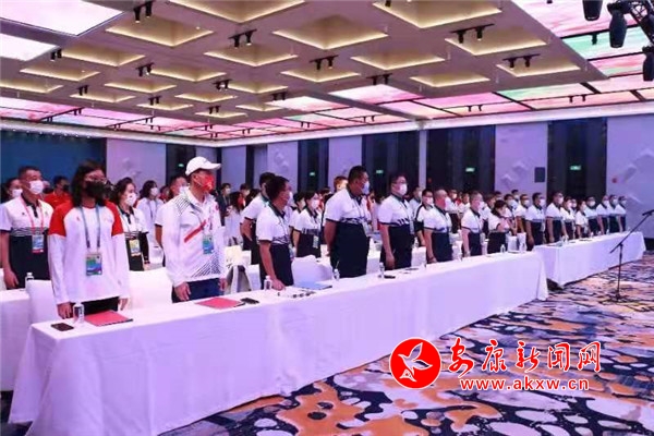 會議在莊嚴的國歌聲中開始,全體運動員、教練員、技術(shù)官員身著隊服,肅立齊唱國歌。