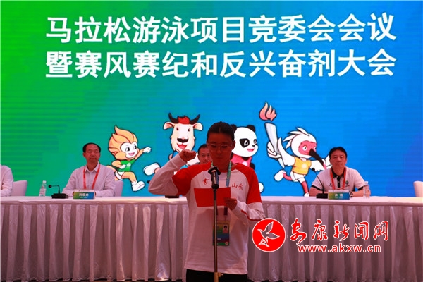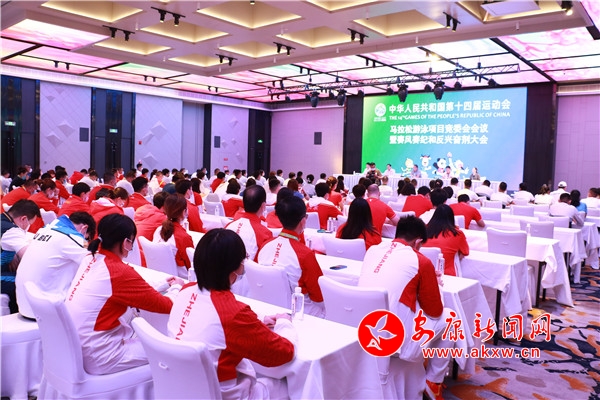 許琦宣讀了《第十四屆全國運動會賽風賽紀違規(guī)處罰規(guī)定》、《第十四屆全國運動會賽風賽紀和反興奮劑工作的通知》。運動員、教練員、技術(shù)官員代表進行了反興奮劑宣誓,競委會各處室負責人、全體技術(shù)官員、各運動隊簽署了賽風賽紀和反興奮劑承諾書。