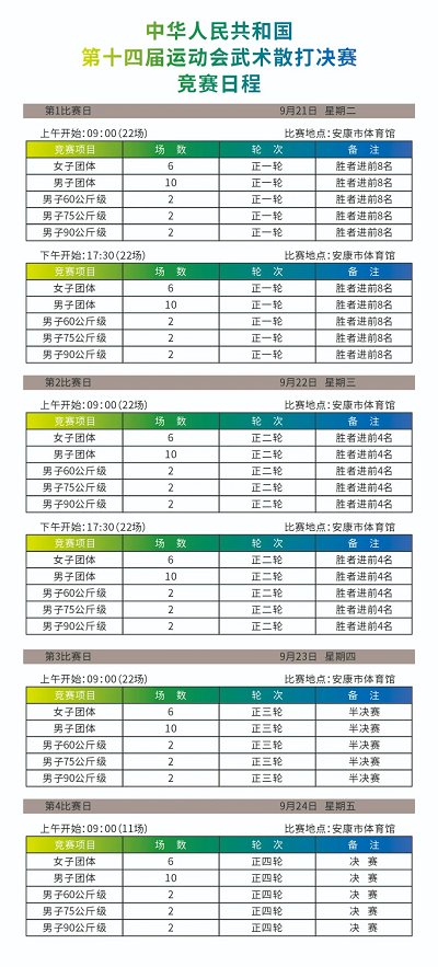 9月21日—24日第十四屆全國運動會武術散打比賽將在安康體育館正式開賽,這份“最全觀賽指南”快快查收!