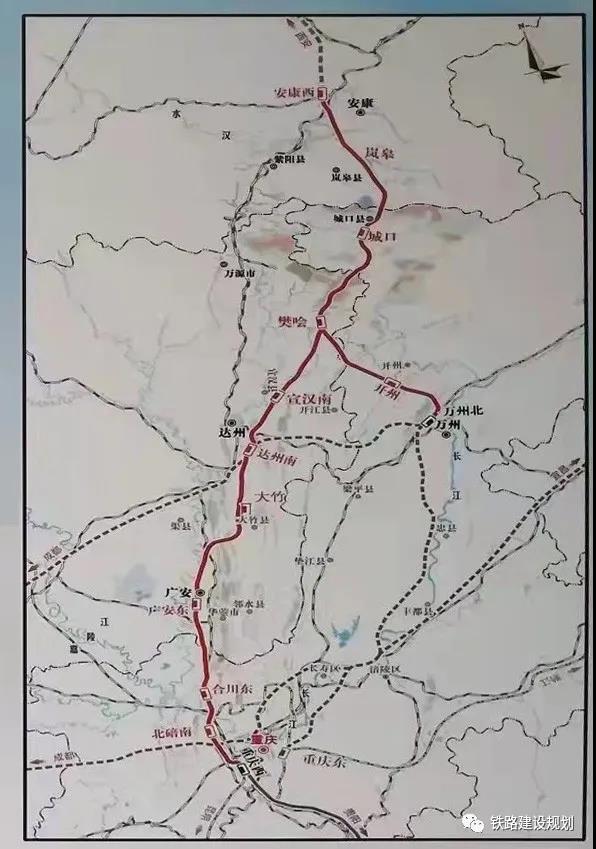 項目起自在建西安至安康高速鐵路安康西站,經(jīng)嵐皋、城口、宣漢、達(dá)州、大竹、廣安、合川、北碚,至重慶樞紐重慶西站,線路全長477.9公里(其中新建線路446.7公里),設(shè)11座車站;同步建設(shè)樊噲經(jīng)開州至萬州連接線,長90.2公里,設(shè)3座車站。配套新建本線至蘭渝鐵路、襄渝鐵路、成達(dá)萬高鐵聯(lián)絡(luò)線約26公里。