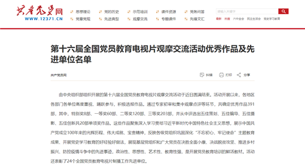 由中央組織部組織開展的第十六屆全國(guó)黨員教育電視片觀摩交流活動(dòng)近日?qǐng)A滿結(jié)束,全國(guó)共391部?jī)?yōu)秀作品和24個(gè)先進(jìn)單位獲獎(jiǎng)。Rii安康新聞網(wǎng)