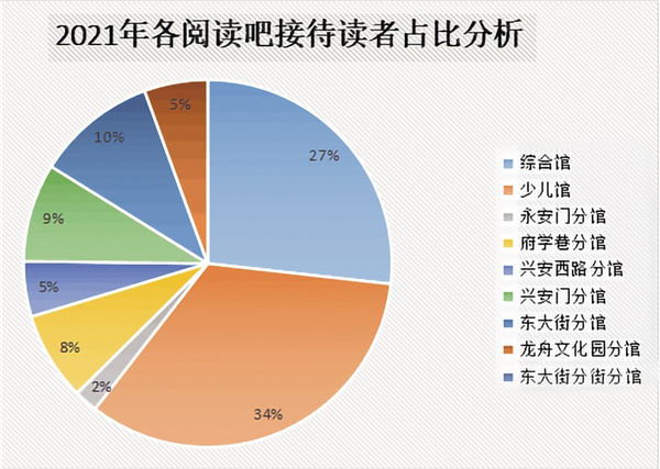 2021年,接待人數(shù)最多的閱讀場(chǎng)館也是少兒館,接待人數(shù)147188人次,占全年接待讀者總?cè)藬?shù)的34%。借閱排行榜的前20名均為少兒圖書,其中楊紅櫻所著《笑貓日記·藍(lán)色的兔耳朵草》全年借閱次數(shù)達(dá)到97次。這表明,隨著雙減政策的落地和少兒閱讀積分存折、親子閱讀等少兒閱讀推廣活動(dòng)的開展,極大地調(diào)動(dòng)了少兒群體的閱讀積極性,圖書館正逐漸成為學(xué)生群體課余生活的新選擇。