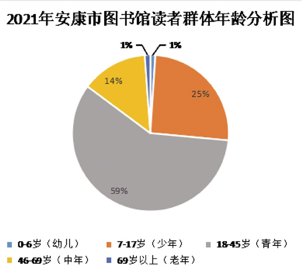 從讀者年齡段來(lái)看,市圖書館2021年有幼兒讀者(0-6歲)324人,少兒讀者(7-17歲)8098人,青年讀者(18-45歲)18686人,中年讀者(45-69歲)4347人,老年讀者(69歲以上)366人。讀者群體中青年讀者占比最大,占讀者群體的59%。少年讀者和青年讀者仍是圖書館的主要服務(wù)對(duì)象,總占比達(dá)到84%。