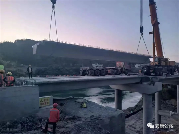 5月2日晚八點,隨著最后一片20米預(yù)應(yīng)力箱梁穩(wěn)穩(wěn)落在橋梁支座上,安嵐高速吉河連接線改建工程老爪溝大橋順利合龍。