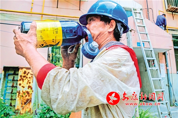 圖6:7月17日下午,漢濱區(qū)印染廠社區(qū)內(nèi),中國(guó)電信公司安康分公司施工人員的作業(yè)間隙。 李春江 攝