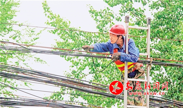 與此同時(shí),不遠(yuǎn)處的公路局家屬院內(nèi),國(guó)網(wǎng)漢濱分公司的工作人員也正在隔離區(qū)域內(nèi)進(jìn)行空中作業(yè)。盡管汗水浸濕了厚重的牛仔工裝,但為了盡量縮短施工時(shí)間,現(xiàn)場(chǎng)的工作人員仍以最快的速度甄別、剪除廢線,梳理捆扎。不一會(huì)兒,一小片雜亂線纜就變得橫平豎直、高低一致、規(guī)范有序。