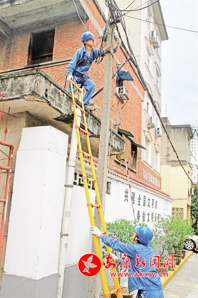 圖1、2、3:7月18日上午,在漢濱區(qū)大南街,國(guó)網(wǎng)安康供電公司漢濱供電分公司的工作人員正在對(duì)電網(wǎng)線路進(jìn)行整治。 記者 張喬 攝