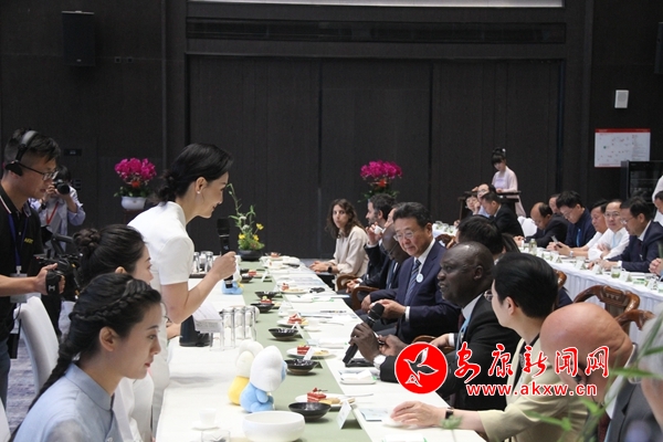 “大使品茶”為現(xiàn)場嘉賓呈現(xiàn)了一場精彩絕倫的茶文化盛宴。 茶香琴韻相伴下,與會嘉賓欣賞茶藝、體驗茶道,品茗點評了安康富硒茶中的綠茶、白茶、紅茶、秦漢古茶,以及福州茉莉花茶、湖南君山銀針等茗茶,各類茶品飄逸外觀和濃香入肺的回味給嘉賓們留下了深刻印象。