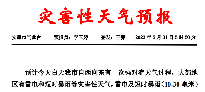 5月31日5時50分,安康市氣象臺發(fā)布《災害性天氣預報》。