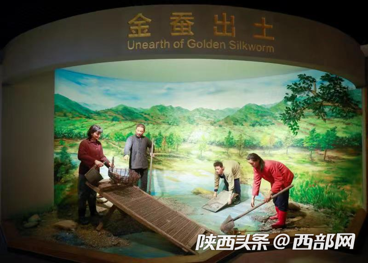 “和很多珍貴文物一樣,這條‘鎏金銅蠶’也是發(fā)現(xiàn)于不經(jīng)意間。”金蠶之鄉(xiāng)展覽館講解員向媒體采訪團(tuán)介紹了那段歷史——1984年,石泉縣池河流域譚家灣農(nóng)民譚福全,在河水中淘金時,發(fā)現(xiàn)一條金光燦燦的金蠶。這只蠶通長5.6厘米,胸圍1.9厘米,胸高1.8厘米,首尾9個腹節(jié),體態(tài)逼真。此種鎏金蠶是迄今國內(nèi)首次發(fā)現(xiàn)的,經(jīng)專家鑒定為國家一級文物,它是西漢時期皇帝褒獎蠶桑生產(chǎn)的“御賜獎品”,非常珍貴。