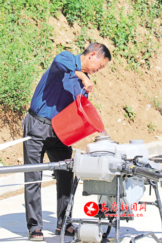 作為西河村獼猴桃園區(qū)負(fù)責(zé)人,69歲的何克祥正站在山路上指揮著無人機(jī)對(duì)園區(qū)果樹進(jìn)行飛防。