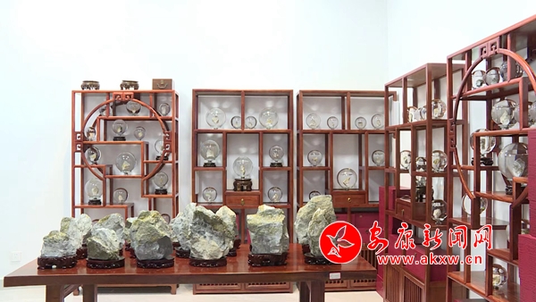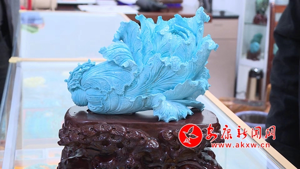 松石展柜中,擺放著各類(lèi)精致時(shí)尚的綠松石飾品,這些通過(guò)雕刻家設(shè)計(jì)打磨后的擺件、項(xiàng)鏈、手鏈、耳墜等,都是藝術(shù)臻品,它們吸引著人們的目光,讓人愛(ài)不釋手。