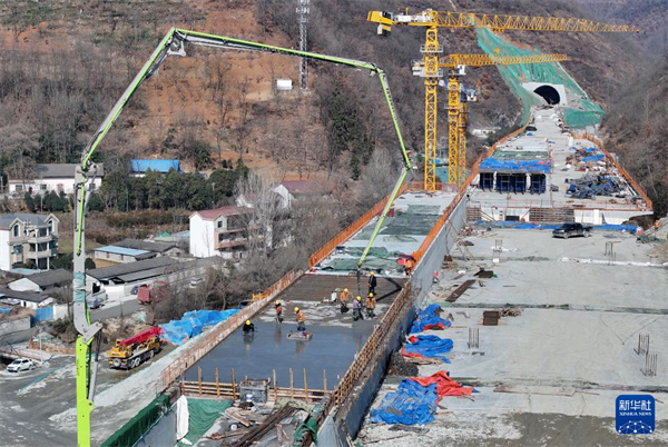 △ 工人在中鐵十一局集團(tuán)西康高鐵4標(biāo)段項(xiàng)目施工現(xiàn)場(chǎng)作業(yè)(1月26日攝,無(wú)人機(jī)照片)。新華社記者 邵瑞 攝