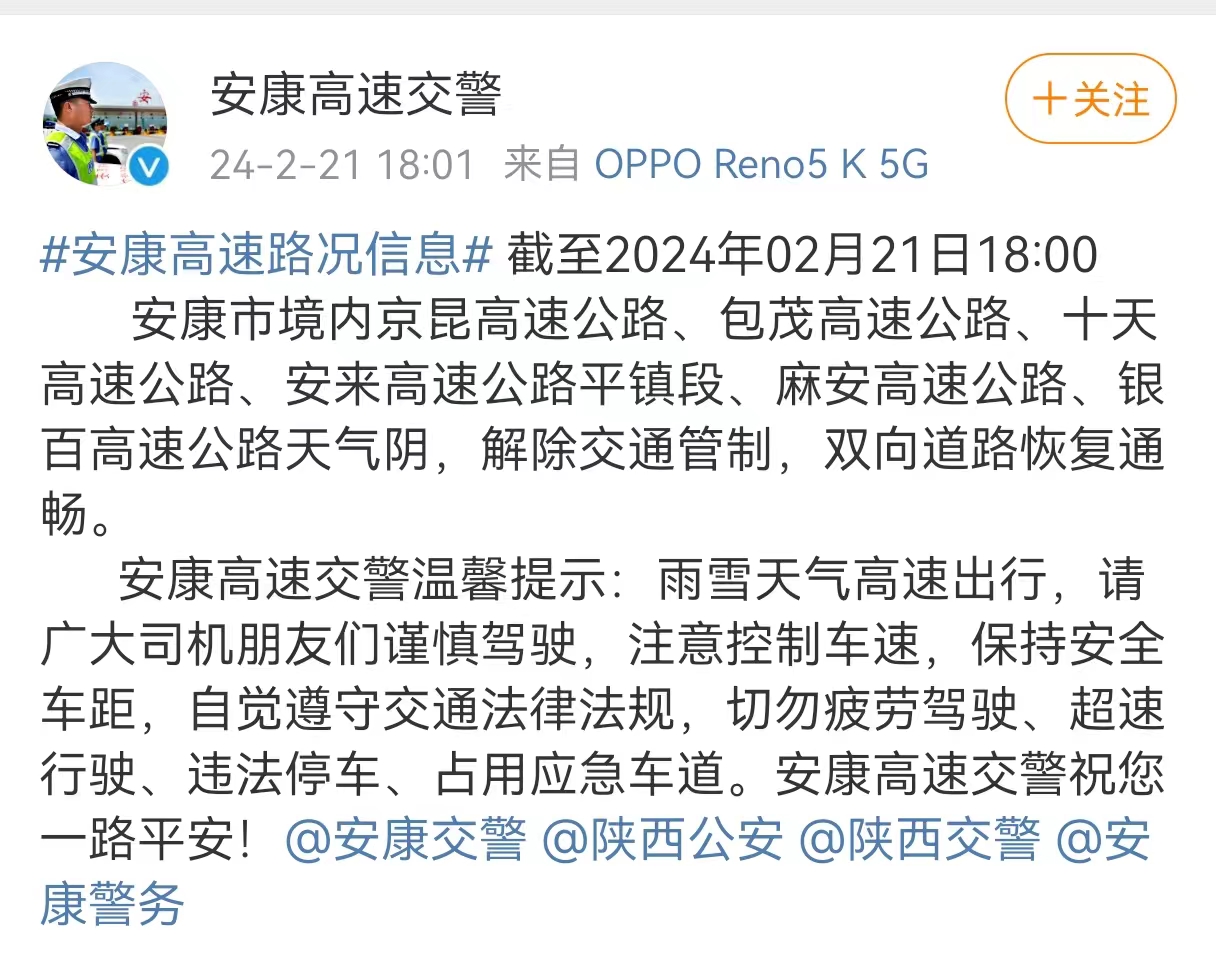 2月21日18時,安康高速交警發(fā)布消息:截至2024年02月21日18:40,安康市境內(nèi)京昆高速公路、包茂高速公路、十天高速公路、安來高速公路平鎮(zhèn)段、麻安高速公路、銀百高速公路天氣陰,解除交通管制,雙向道路恢復通暢。 禁止危化品運輸車輛和七座以上客車駛?cè)敫咚佟?span style="display:none">ric安康新聞網(wǎng)