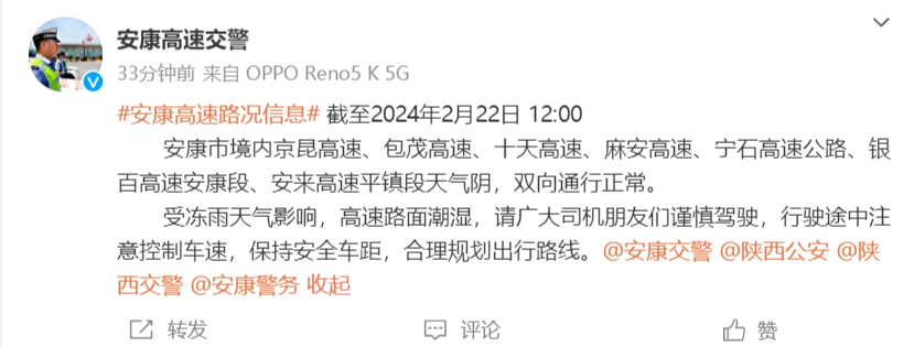 據(jù)安康高速交警消息:截至2024年2月22日12:00,安康市境內(nèi)京昆高速、包茂高速、十天高速、麻安高速、寧石高速公路、銀百高速安康段、安來(lái)高速平鎮(zhèn)段天氣陰,雙向通行正常。受凍雨天氣影響,高速路面潮濕,請(qǐng)廣大司機(jī)朋友們謹(jǐn)慎駕駛,行駛途中注意控制車(chē)速,保持安全車(chē)距,合理規(guī)劃出行路線。 hKJ安康新聞網(wǎng)