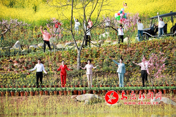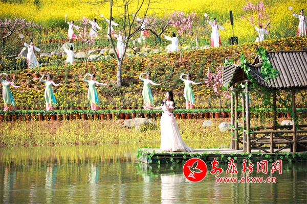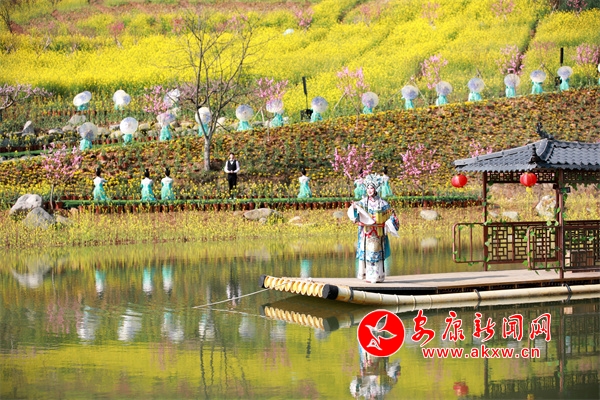 春日的水田溝村生機勃發(fā),漫山的油菜花在暖陽下爭相怒放,山坡下是一汪清澈的湖水;顒右郎骄蛣、水陸并用,將演員、舞臺、道具與水田溝村地形地貌完美融合,營造出“人在畫中游,畫在景中走”的和美景象。隨著原創(chuàng)歌曲《水田溝的油菜花》悠揚動聽的歌聲從湖面的小船傳來,活動正式拉開帷幕,獨唱《問春》、情景詩朗誦《母親河》、歌伴舞《醉美桃花源》、情景劇《桃花源記》、漢劇歌舞《喬木花》、原創(chuàng)歌曲《阿依娜》、歌伴舞《幸福安康》等精彩節(jié)目相繼上演,悠揚的歌聲、曼妙的舞姿在湖上、在油菜花田、在蜿蜒的山路漸次呈現,將現場觀眾和游客迅速帶入安康桃花源美麗夢幻的油菜花海世界,沉浸式感受安康高新區(qū)產城綠融合發(fā)展和鄉(xiāng)村振興的顯著成效。