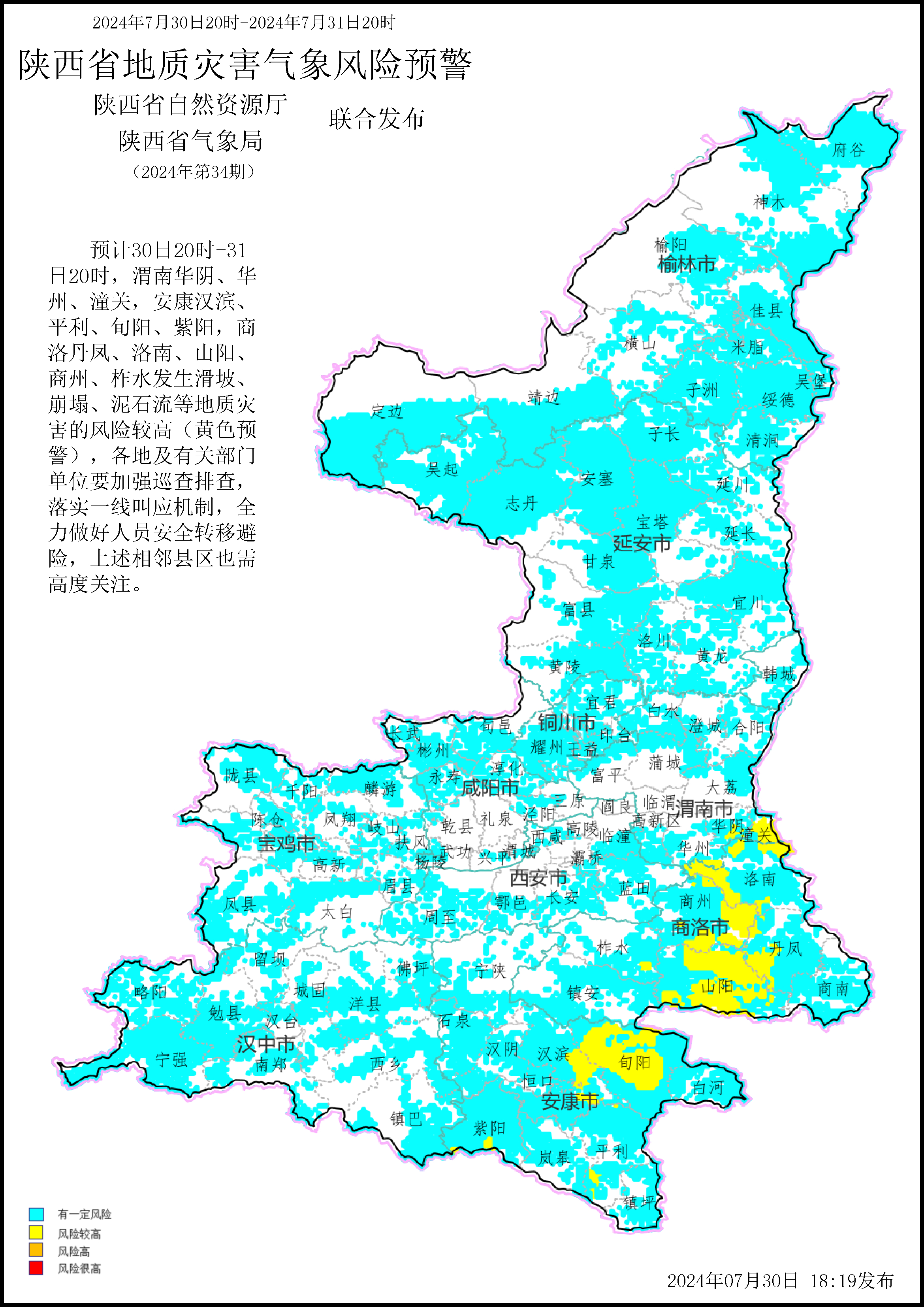 陜西省自然資源廳與陜西省氣象局聯合發(fā)布地質災害氣象風險預警:預計2024年7月30日20時—31日20時,渭南華陰、華州、潼關,安康漢濱、平利、旬陽、紫陽,商洛丹鳳、洛南、山陽、商州、柞水發(fā)生滑坡、崩塌、泥石流等地質災害的風險較高(黃色預警),各地及有關部門單位要加強巡查排查,落實一線叫應機制,全力做好人員安全轉移避險,上述相鄰縣區(qū)也需高度關注。 wXr安康新聞網