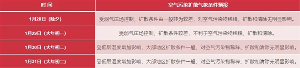 1月24日至27日,受雨雪降溫天氣影響,擴(kuò)散條件較好。1月28日至29日,地面氣壓場(chǎng)轉(zhuǎn)弱,擴(kuò)散條件轉(zhuǎn)差,我市大部空氣質(zhì)量以良至輕度污染為主,煙花爆竹集中燃放時(shí)段可能出現(xiàn)短時(shí)重度或以上污染,首要污染物為PM2.5。1月30日至31日,受低層濕度增加影響,擴(kuò)散條件一般。2月1日至4日,受冷空氣清除作用影響,擴(kuò)散條件較好。
