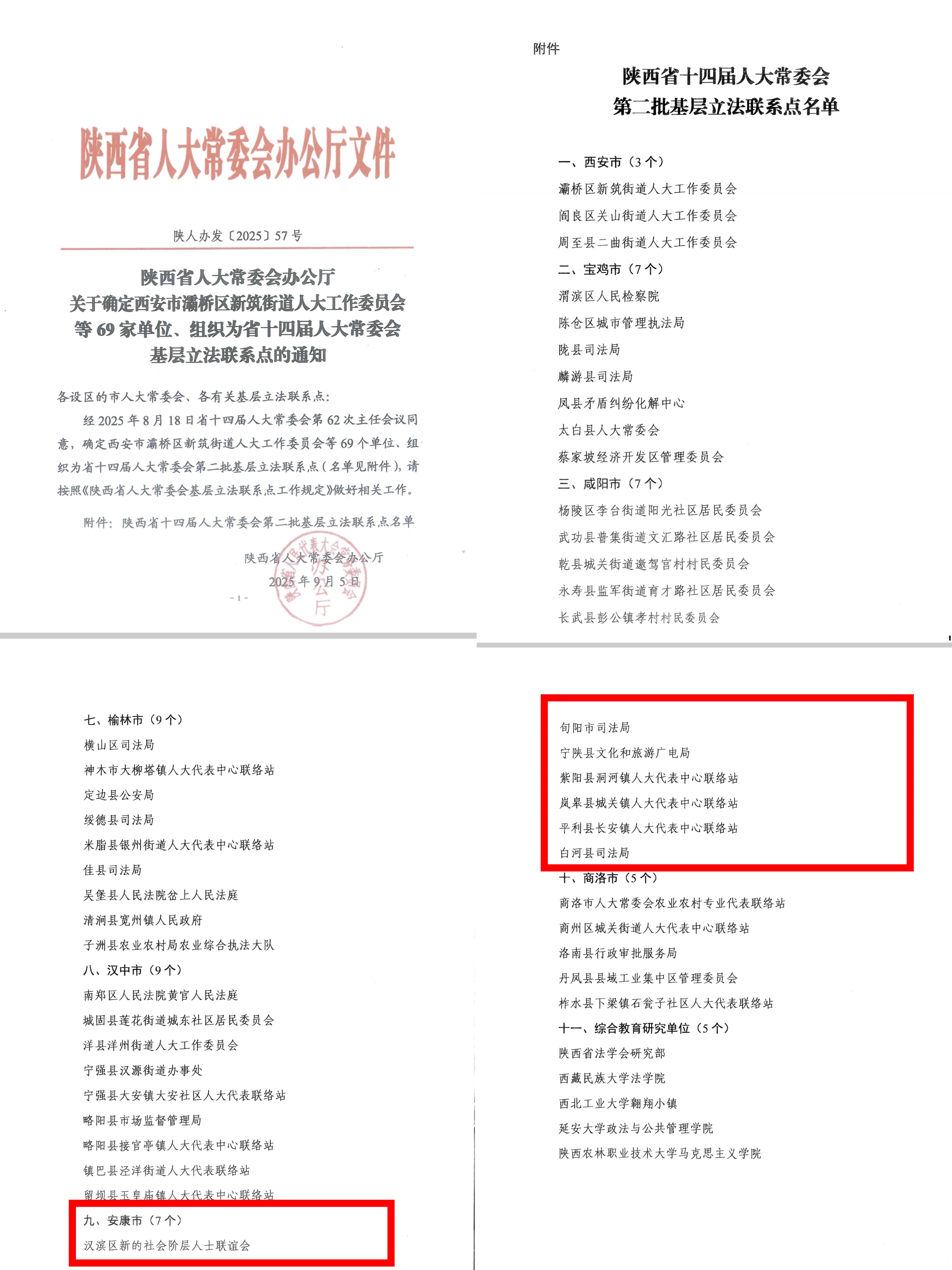 本網(wǎng)訊(通訊員 段文貞)9月5日,省人大常委會(huì)公布《陜西省十四屆人大常委會(huì)第二批基層立法聯(lián)系點(diǎn)名單》,我市漢濱區(qū)新的社會(huì)階層人士聯(lián)誼會(huì)、旬陽(yáng)市司法局、寧陜縣文化和旅游廣電局、紫陽(yáng)縣洞河鎮(zhèn)人大代表中心聯(lián)絡(luò)站、嵐皋縣城關(guān)鎮(zhèn)人大代表中心聯(lián)絡(luò)站、平利縣長(zhǎng)安鎮(zhèn)人大代表中心聯(lián)絡(luò)站、白河縣司法局7家單位、組織成功入選。這是繼2023年省人大常委會(huì)在我市確立首批4個(gè)基層立法聯(lián)系點(diǎn)以來(lái),通過(guò)綜合考核、嚴(yán)格篩選再次確立的7個(gè)基層立法聯(lián)系點(diǎn),實(shí)現(xiàn)了全市各縣(市、區(qū))全覆蓋。buu安康新聞網(wǎng)