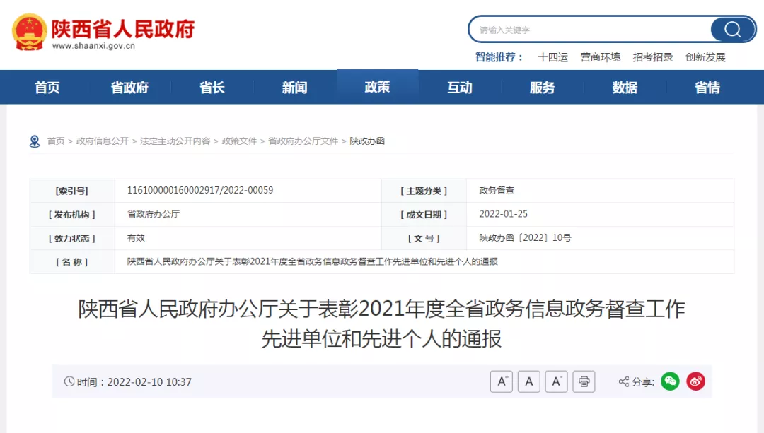 近日,省政府辦公廳印發(fā)《關(guān)于表彰2021年度全省政務(wù)信息政務(wù)督查工作先進(jìn)單位和先進(jìn)個(gè)人的通報(bào)》。安康市人民政府辦公室(市政府督查室)、漢陰縣人民政府辦公室……