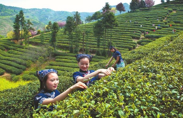 “三月三哪上茶山(喲咿兒?jiǎn)?,姐妹采茶呀心喜歡哪(喲咿兒?jiǎn)?,山山飄清香,處處好茶園……”春分前,紫陽(yáng)富硒茶觀(guān)光園滿(mǎn)山翠綠已然蘇醒。茶園里,唐丹丹唱的紫……