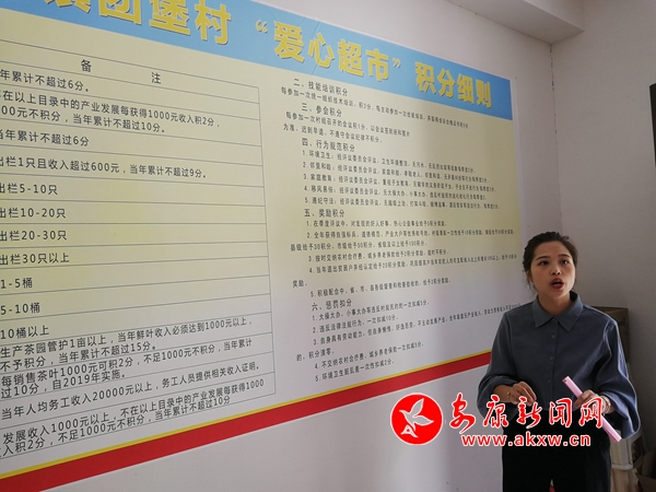 今年4月29日,61歲的田遠(yuǎn)樹和丈夫一起來到愛心超市,兌換了大米和消毒液,她說:“我們表現(xiàn)好,就能兌換積分拿東西,政策好啊”。原來,他們一家種茶、養(yǎng)蜂、養(yǎng)豬、養(yǎng)雞,因?yàn)楫a(chǎn)業(yè)發(fā)展的好,積分就高,后來田遠(yuǎn)樹被村里評為好媳婦,又有了加分項(xiàng)目。