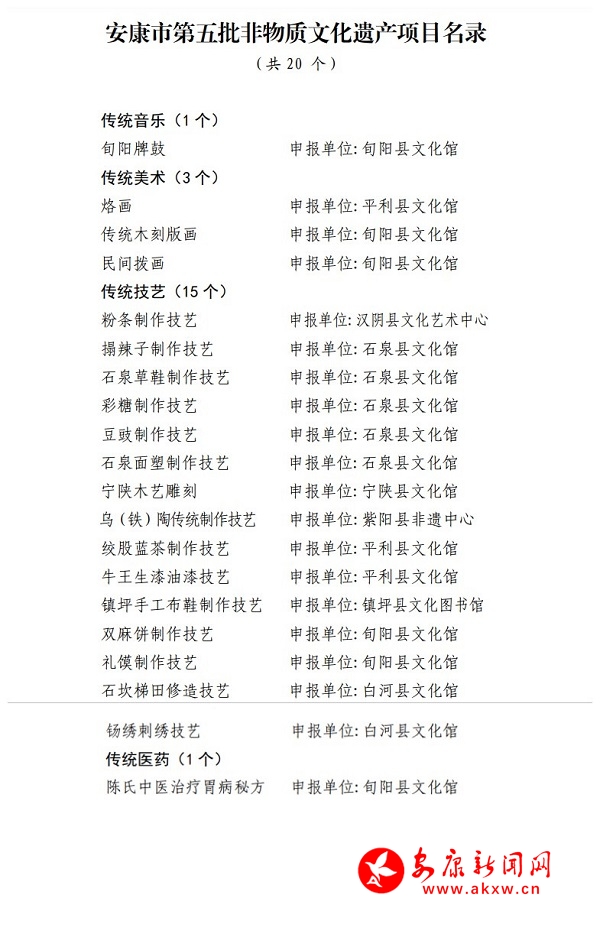 本網(wǎng)訊(實(shí)習(xí)記者 殷婷 楊一 )近日,安康市第五批非物質(zhì)文化遺產(chǎn)項(xiàng)目名錄公布。按照《中華人民共和國(guó)非物質(zhì)文化遺產(chǎn)法》和《陜西省非物質(zhì)文化遺產(chǎn)條例》相關(guān)規(guī)定,經(jīng)申報(bào)、評(píng)審、公示等程序,“旬陽(yáng)牌鼓”等四大類(lèi)20 個(gè)項(xiàng)目被列入該名錄,具體名單如下:Ftx安康新聞網(wǎng)