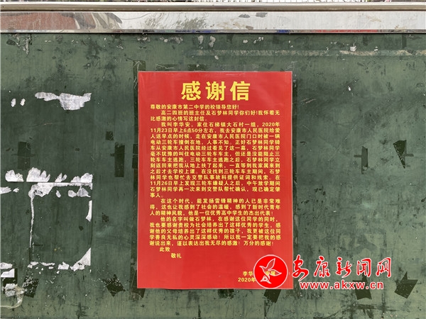 11月23日早上6:50分左右,安康市第二中學(xué)高二學(xué)生石夢林像往常一樣去上課。在經(jīng)過安康市人民醫(yī)院十字路口時,他看到一輛疾馳而過的三輪車將一人(李先生)撞倒在地,司機未理會傷者,準(zhǔn)備逃逸。石夢林毫不猶豫地向肇事車追去,試圖阻攔。奮力追逐二百余米后,未能阻攔成功。他又立即返回,將傷者扶至路邊,用自己手機撥通了報警電話,詢問了傷者家人聯(lián)系方式,聯(lián)系上家屬后將傷者送往醫(yī)院救治。