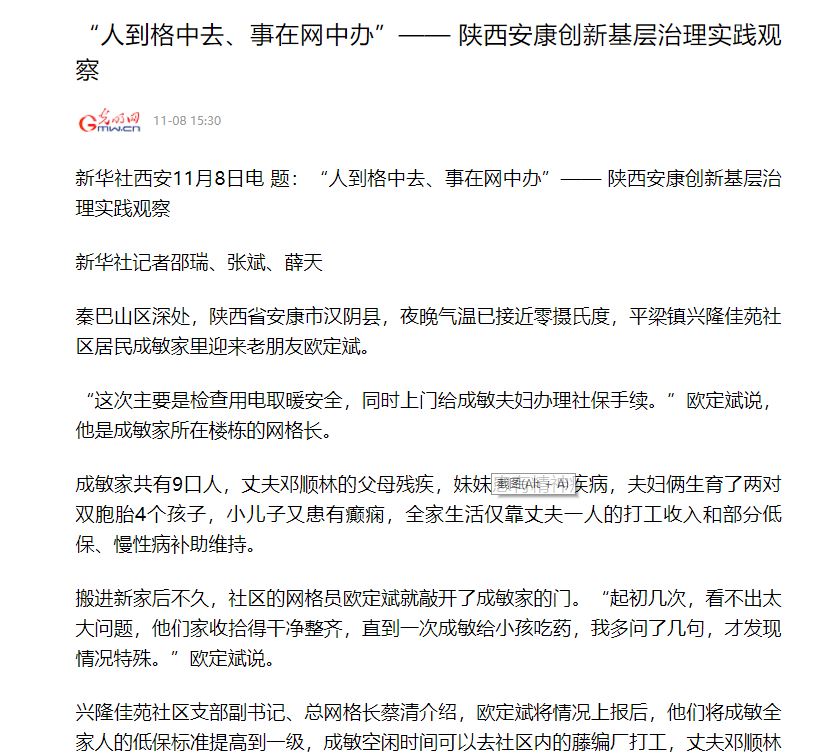本網(wǎng)訊(實(shí)習(xí)記者 趙漪湉)11月8日,新華社刊發(fā)記者邵瑞、張斌、薛天采寫(xiě)的稿件《“人到格中去、事在網(wǎng)中辦”——陜西安康創(chuàng)新基層治理實(shí)踐觀察》,聚焦我市創(chuàng)新建立的“321”基層治理模式。