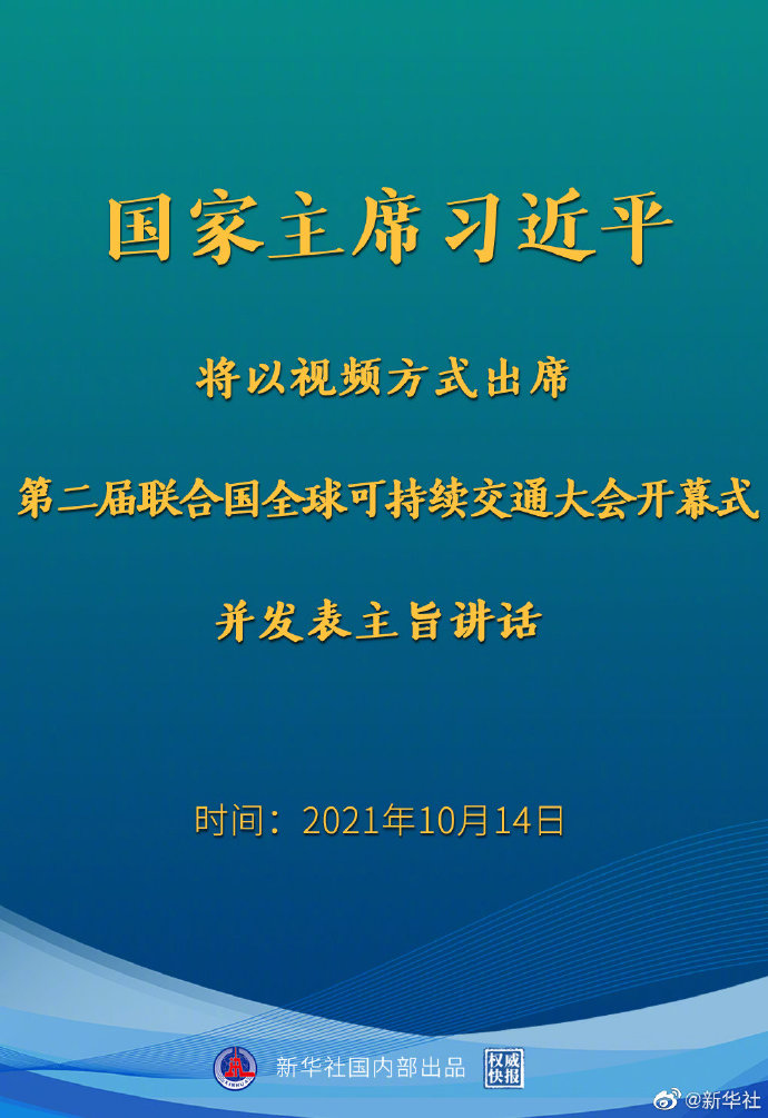 新華社北京10月13日電 外交部發(fā)言人華春瑩13日宣布:國家主席習近平將于10月14日以視頻方式出席第二屆聯(lián)合國全球可持續(xù)交通大會開幕式并發(fā)表主旨講話。MqA安康新聞網