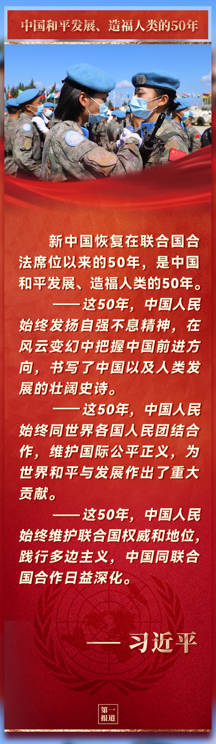 新中國恢復(fù)在聯(lián)合國合法席位以來的50年,是中國和平發(fā)展、造福人類的50年。