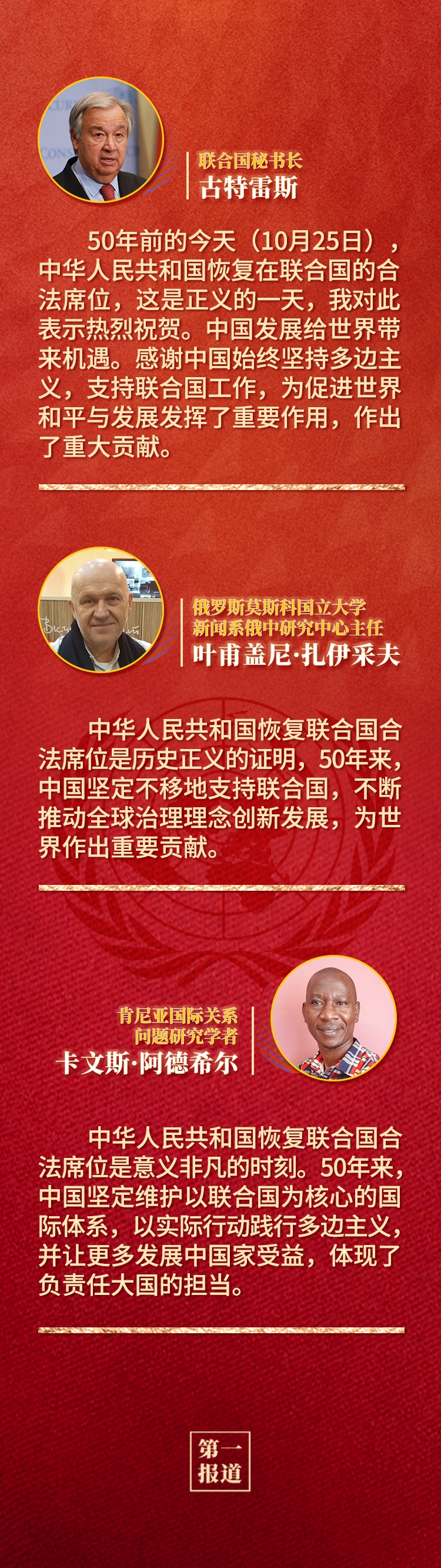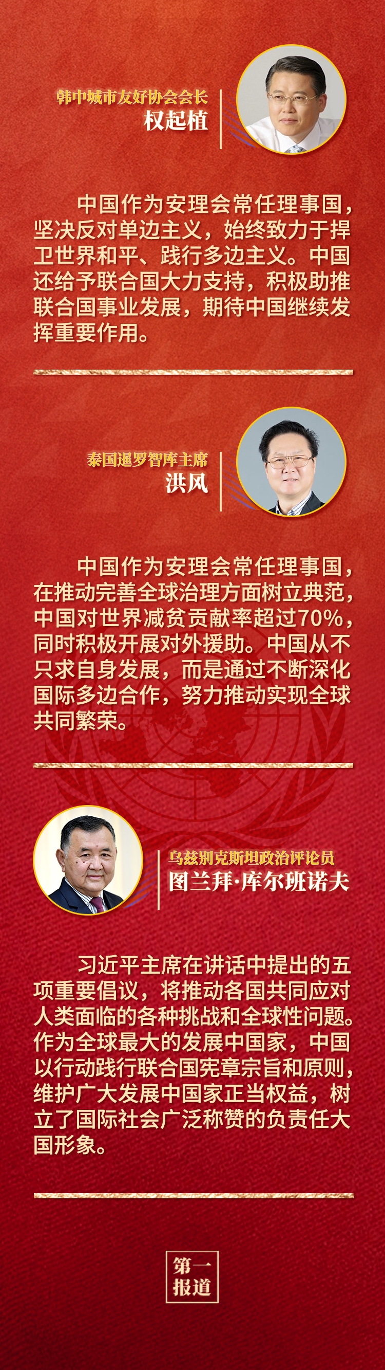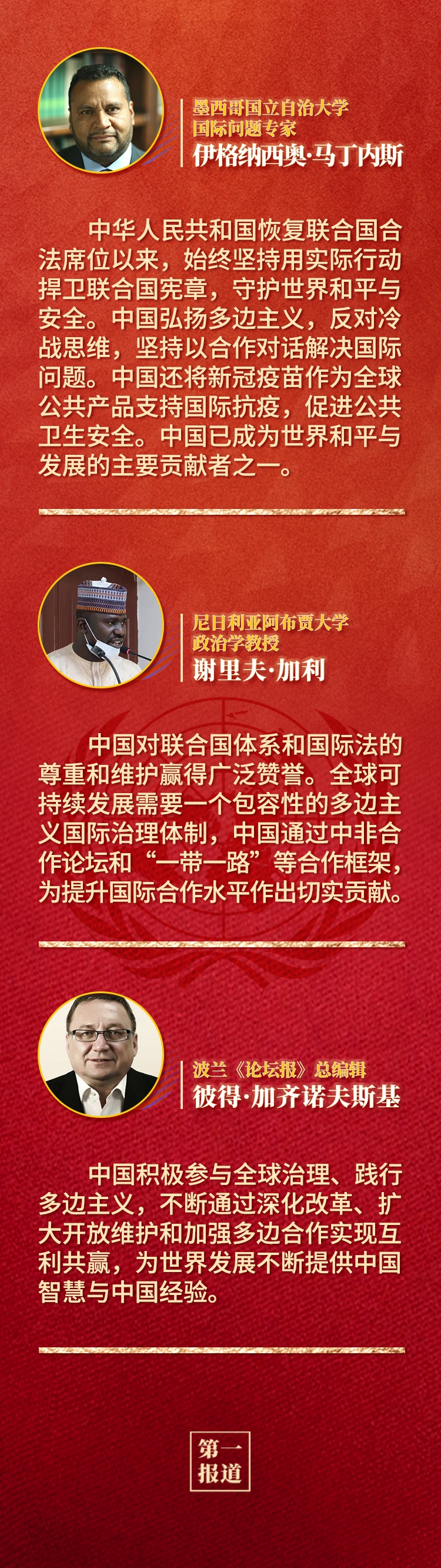 多國人士認(rèn)為,中華人民共和國恢復(fù)聯(lián)合國合法席位是世界和聯(lián)合國歷史上的一個(gè)大事件,習(xí)近平主席的重要講話回顧了中國和平發(fā)展、造福人類的50年,為實(shí)現(xiàn)世界永續(xù)和平發(fā)展提出重要倡議,為全球共同推動(dòng)構(gòu)建人類命運(yùn)共同體注入新的強(qiáng)大動(dòng)力。