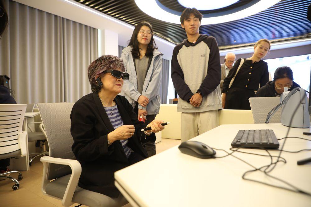 4月15日,在培黎職業(yè)學(xué)院,英中了解協(xié)會榮譽(yù)主席佐伊·里德體驗(yàn)學(xué)生們親手設(shè)計搭建的虛擬現(xiàn)實(shí)場景模型。新華社記者 張智敏 攝