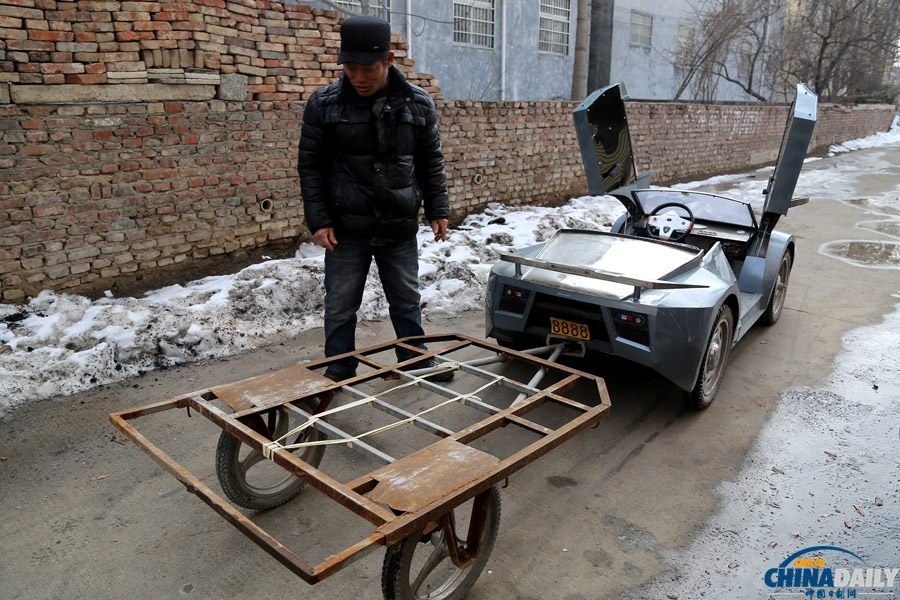 老郭平時(shí)做點(diǎn)小生意,為了拉東西,特意在車子后部設(shè)計(jì)了掛鉤,可與板車連接,跑車變成拖車。(侯建勛 攝)