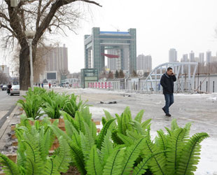 2015年3月15日,吉林省吉林市,在吉林市吉林大街上,市民從形似“油麥菜”的綠色塑料假花前行走。圖片來源:王凱冬近日,市民發(fā)現(xiàn)位于吉林市吉林大街與濱江中路……