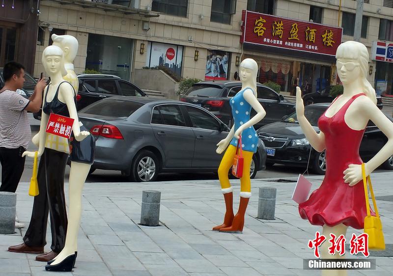 2014年8月6日,湖北宜昌市桔城路福久源商業(yè)街廣場上塑起4個嶄新的時尚模特塑像,其中3個“胸器”誘人的性感女模特塑像身上掛出了“嚴禁觸摸”提示牌!