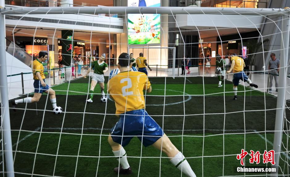 6月11日,濟(jì)南一商家將世界杯巴西隊(duì)“主場”比賽模型搬進(jìn)商場,吸引消費(fèi)者關(guān)注。2014年世界杯足球賽開賽在即,為迎接此項(xiàng)盛事,濟(jì)南的商家紛紛打造別具匠心的球……